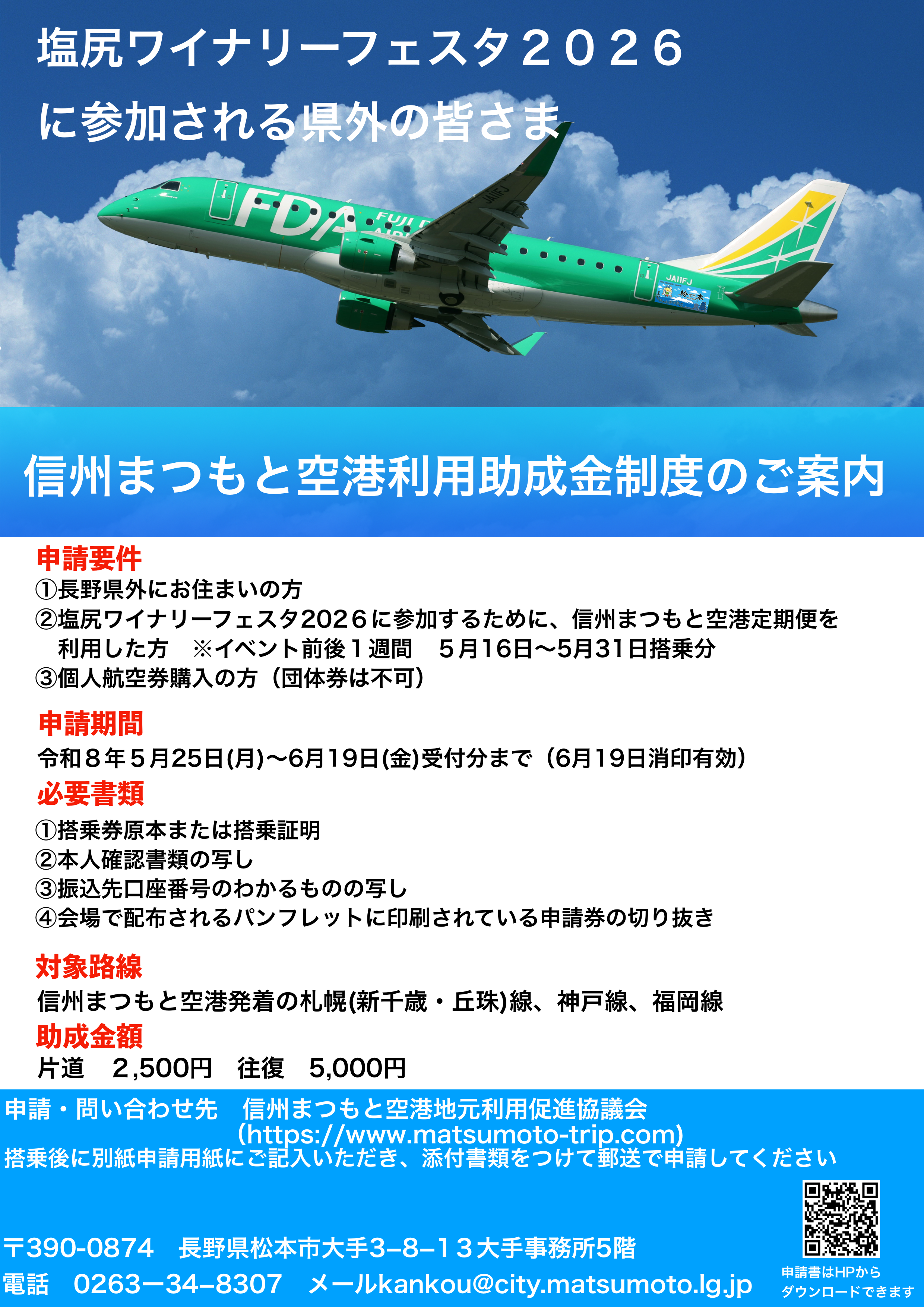 信州まつもと空港FDA定期便を利用して下記イベントに参加すると、助成金を交付いたします。